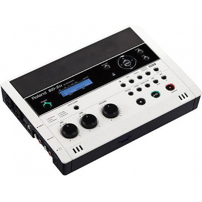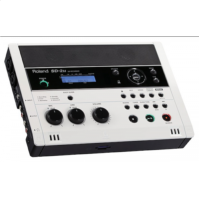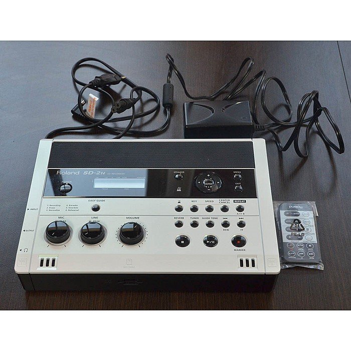 The SD-2u SD Recorder from Roland can be used to record audio directly to SD and SDHC cards. It features built-in stereo microphones as well as two combination XLR/TRS microphone inputs with 48V phantom power for miking flexibility. It also accepts audio from a 1/8" plug in power mic input as well as stereo RCA line inputs. The SD-2u is also designed to be used as a training tool and features a built-in tuner and metronome as well as playback speed and key adjustment. These features allow you to slow a song down to learn a difficult passage or adjust its key to suit your voice. Roland's Center Focus feature allows you to isolate a track's mono sounds, such as vocals, to make them easier to hear and learn. The included wireless remote allows you to start and stop recording from a distance. The SD-2u can be powered by six AA batteries or the included AC adapter.