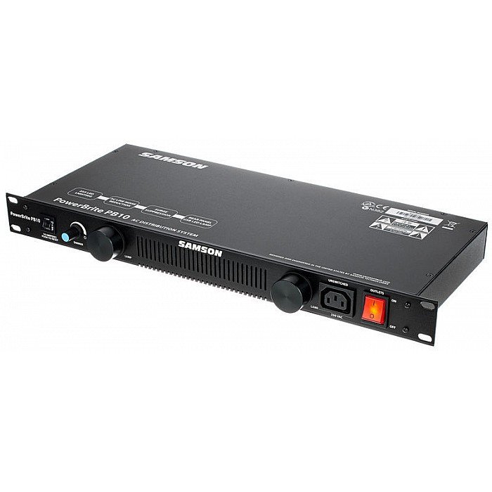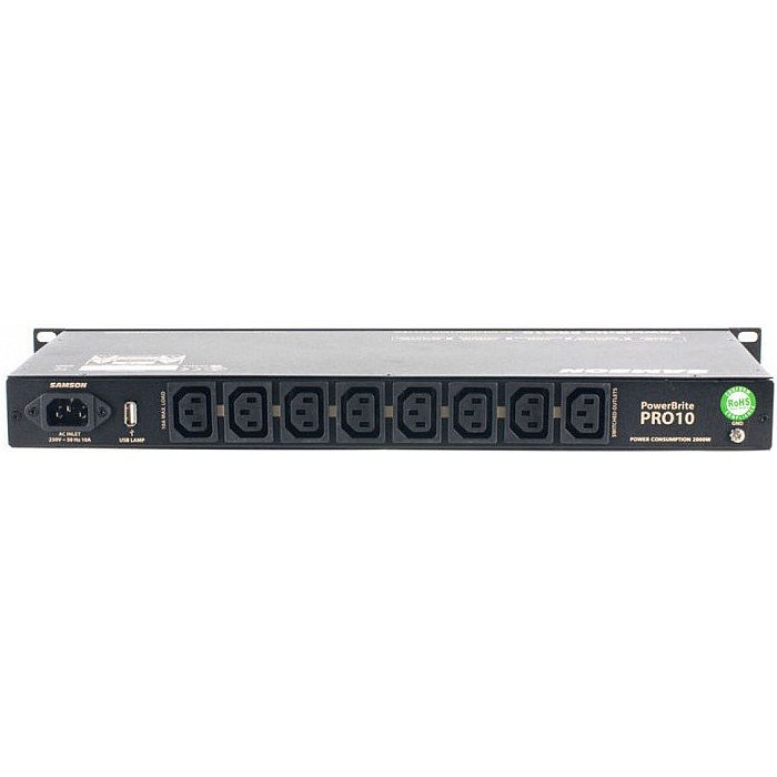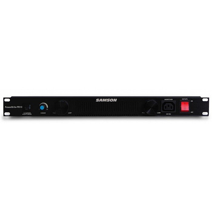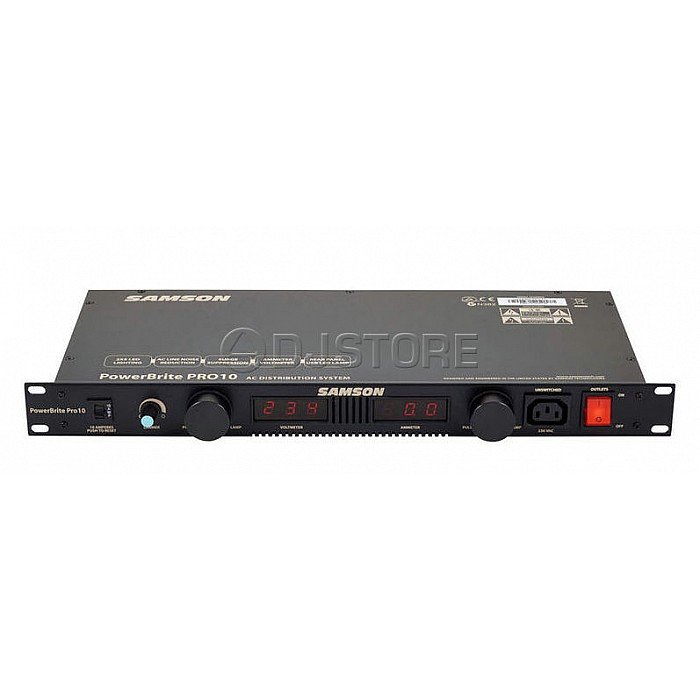 The Samson Powerbrite Pro 10 is a 19 inch rackmount power conditioner with dimmable LED rack lighting to the front, gooseneck USB powered LED lamp included for the rear and dual digital voltage multi-meters.