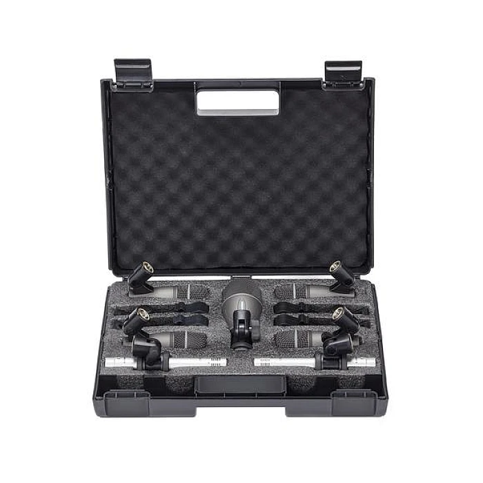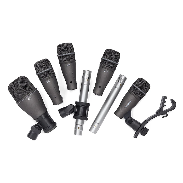 The Samson DK707 7-piece drum mic kit is a complete drum recording package that doesn't cost a mint. A Q71 kick mic, four Q72 dynamic microphones, and two C02 pencil condensers reproduce the natural tone and impact of your drum set. We've found that the dynamic microphones excel on snares and toms, and the condensers craft an accurate 3D image of your drum kit when they're used as overheads. These mics offer superb off-axis noise rejection and effectively capture loud sources. Swivel-style mic adapters and tension-mounted rim clips make microphone placement child's play. The Samson DK707 7-piece drum mic kit includes a durable hardshell carry case for easy portability and storage.