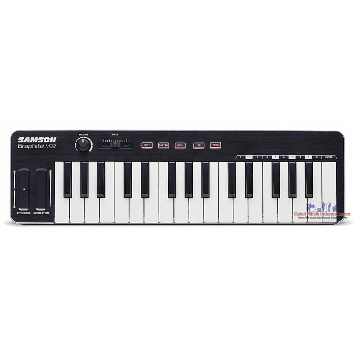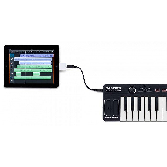 Samson’s Graphite M32 USB MIDI Controller makes home studio and on-the-go music production accessible to everyone. The Graphite M32 features a 32-key velocity-sensitive mini keyboard with a variety of programmable controls for optimal playability and customization in an ultra-portable design. And with iPad/USB bus power and plug-and-play operation, the Graphite M32 makes it easy to get the most out of your music software, no matter where creativity strikes.