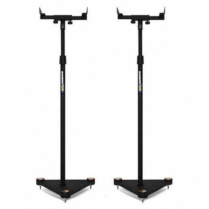 Samson's MS100 Studio Monitor Stands raise your studio performance to a new level. Sold as a pair, these professional-grade monitor stands feature a steel-constructed design with a sleek black finish. Adjustable to 4' in height, the MS100 stands feature adjustable brackets that extend their monitor surfaces width up to 10.25" to accommodate various monitor sizes with a maximum weight of 33 pounds each. In addition, their trianglar metal bases provide carpet spikes for increased traction and rubber pads to reduce vibrations.
