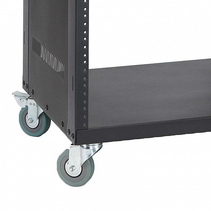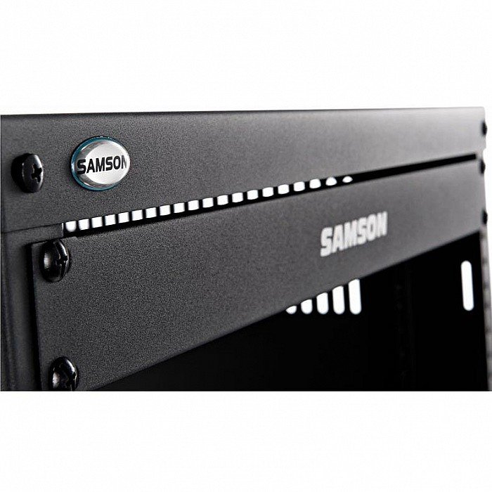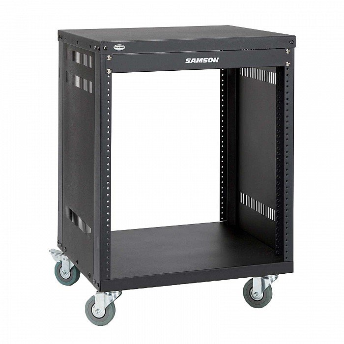 Samson's rugged equipment racks are solid steel and feature fully enclosed steel side panels. They are available in four sizes: 8-space (SRK8), 12-space (SRK12), 16-space (SRK16) and 21-space (SRK21). The racks are set upon 4 heavy-duty, 3-inch (75 mm) casters with locking fronts. Each Samson equipment rack includes a single-space, flanged blank panel. The truly innovative thing is that the unique steel support bar construction allows the racks to be assembled to accept either the European or US thread sizes.