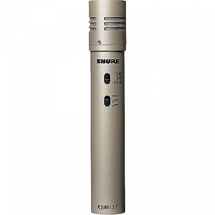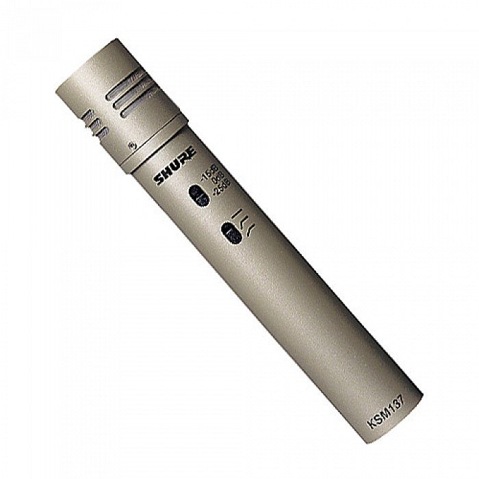 An excellent choice for acoustic guitar and piano. The Shure KSM137 is an end-address condenser microphone with a cardioid polar pattern. Designed for studio use, yet rugged enough for live applications, the KSM137 mic can withstand extremely high sound pressure levels. Its low self-noise and extended frequency response make it ideal for recording acoustic guitar, drum overheads, and hi-hats. Other features include Shure's Class A transformerless preamp circuitry for transparency; extremely fast transient response with minimal distortion; a highly sensitive 2.5-micron gold-layered mylar diaphragm; and a switchable, 3-position low-frequency filter to limit unwanted background noise and proximity effect. The microphone can capture sounds between 20Hz and 20kHz. The Shure KSM137 microphone sports a champagne finish and comes with accessories including a break-resistant mic clip, carrying case, and Popper Stopper windscreen. Requires phantom power. FEATURES