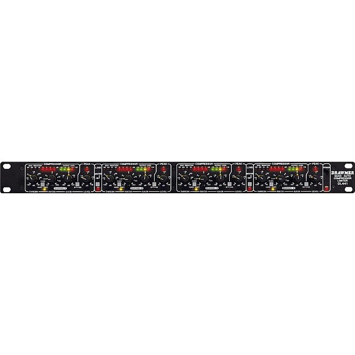 The DL441 Quad Auto Compressor/Limiter captures four channels of Drawmer's innovative DL241 'Auto Compressor' in only 1U of rack space. The inclusion of new sophisticated 'automated' circuitry allows the engineer to precisely control both the dynamic range and 'absolute' peak level of the programme instantly, without sacrificing essential control parameters. This perfect balance of features makes the DL441 ideal for use in sound reinforcement and outside broadcast applications where an economy in rack space is essential. Each channel combines a fully professional 'Auto Attack/Release' Compressor with a variable threshold 'Peak Level' Limiter on the output providing a transparent 'endstop'. High resolution bar-graph displays on each channel allow gain reduction and output level to be viewed simultaneously, of particular importance in darkened concert hall or control room situations.