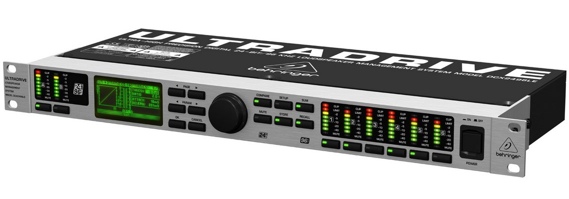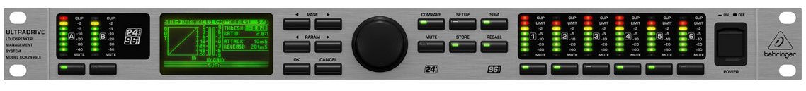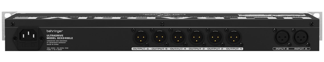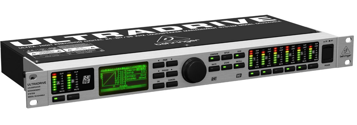Behringer UltraDrive DCX2496LE Loudspeaker Management System at a Glance:The Behringer UltraDrive DCX2496LE is all about giving you massive flexibility. With its 2 analog inputs and 6 analog outputs, you get maximum flexibility in just one rack space. High-end Cirrus Logic 24-bit/96kHz D/A and A/D converters give you major signal integrity and a breathtaking dynamic range of 120dB. You get exacting dynamic EQs for level-dependent equalization and highly musical parametrics, selectable for all inputs and outputs. "Zero-attack" limiters across all output channels guarantee optimized signal and loudspeaker safety.