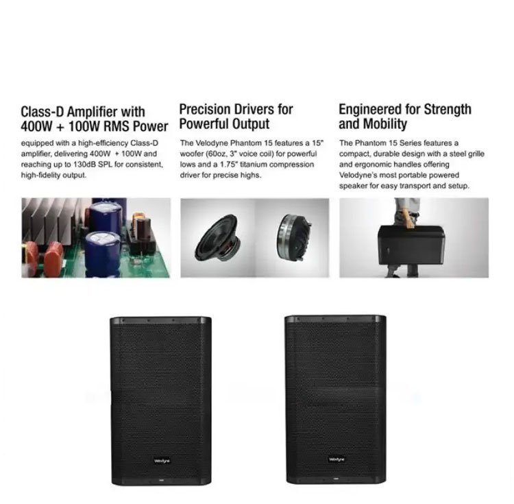 Velodyne Phantom 15 Active Speaker The Velodyne Phantom 15 Active Speaker is the perfect choice for quality audio. With a 15-inch size, this speaker offers 500 Watts RMS power. Equipped with EQ DSP, this speaker delivers optimal sound quality. Bluetooth makes it easy to connect to your devices.