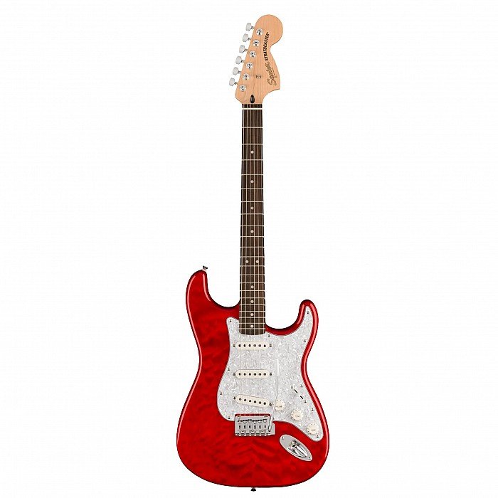 A superb gateway into the esteemed Fender® family, the Squier® Affinity Series™ Stratocaster® QMT delivers legendary design and classic tone to today's aspiring guitae heri. The Strat® features several player-pleasing refinements such as a thin and light body with an attractive quilted maple (QMT) top, a sleek and comfortable "C"-shaped neck profile, a 2-point tremolo bridge for superior tremolo action, and a die-cast tuning engine. sealed with split shaft for smooth, accurate tuning and easy stringing. Loaded with three Squier single-coil pickups for genre-defying sonic variety, this model is ready to accompany any player on any stage.