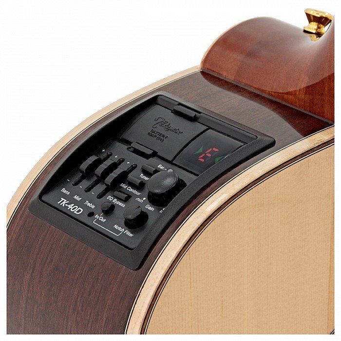 For players seeking a well-balanced guitar with great performance features and refined looks, the GD93CE has a solid spruce top, black walnut/maple sides and a beautiful three-piece black walnut/maple back. The slim mahogany neck and 12"-radius bound laurel fingerboard provide great feel and playability, while the onboard Takamine TK-40D preamp system gives you a built-in tuner, three-band EQ and gain controls, mid contour switch, notch filter and EQ bypass switch for the ultimate in versatility and sound quality.