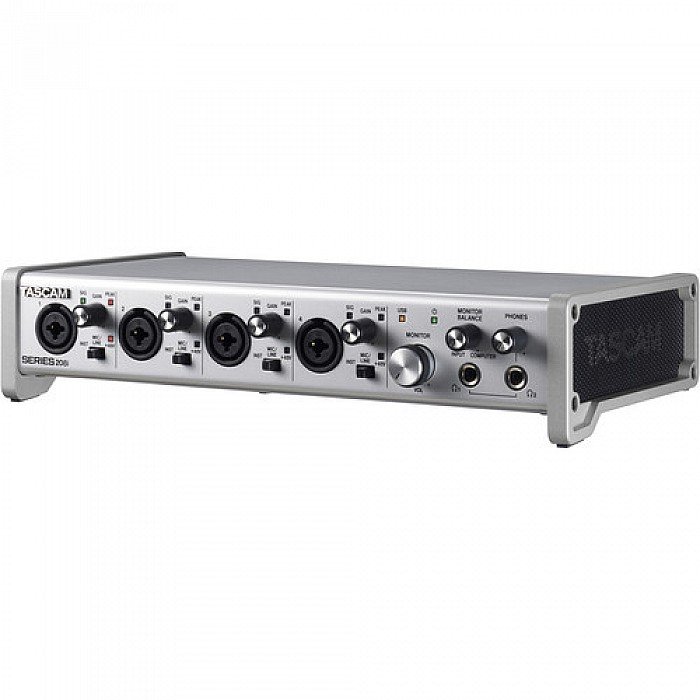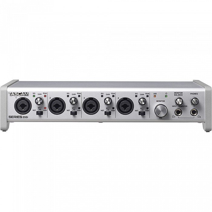 TASCAM SERIES 208i is a professional-quality, mid-grade audio/MIDI interface featuring internal and bundled effects processing, internal mixing, and external software control, well suited for studio, home, and live recording. The 208i sports a four classic TASCAM Ultra-HDDA (High Definition Discrete Amplifier) microphone preamps, which ensure a natural, transparent tone with low noise. The recording and playback engine deliver high-definition 24-bit / 192 kHz resolution and solid stability.