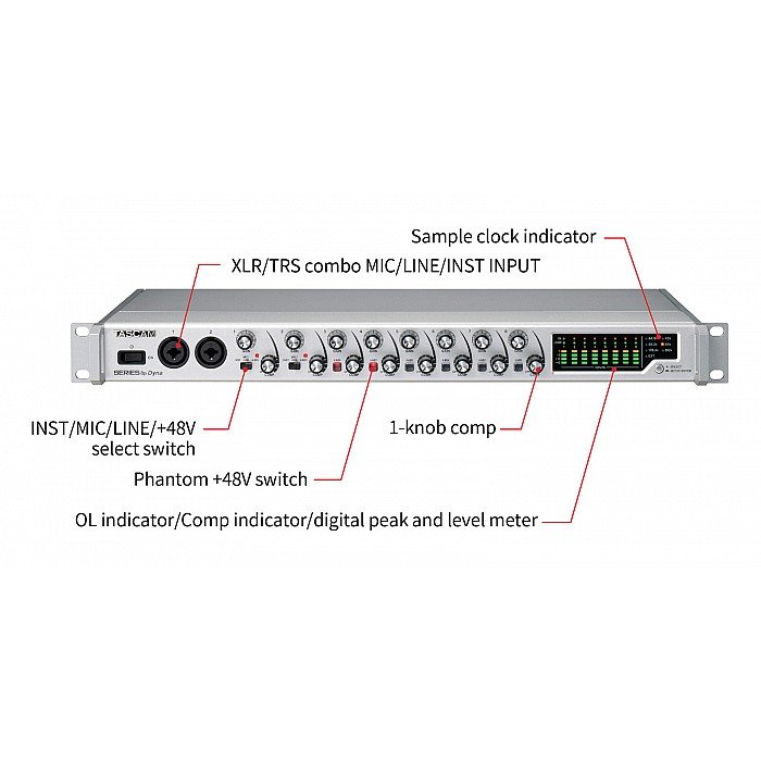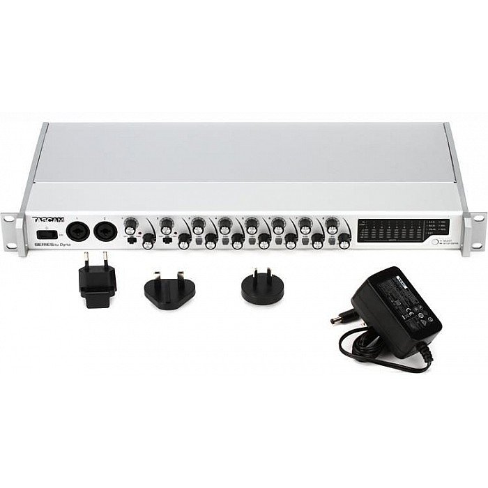 The TASCAM Series 8p Dyna includes a useful array of pro-level features. Word clock I/O BNC connectors, with an in/out/thru switch, enables you to synchronize the Series 8p Dyna with your digital gear — without the pops, dropouts, and other unwanted artifacts. Front-panel analog overload indicators, compression indicators, and digital peak and level meter bars, make monitoring the device’s performance a piece of cake. Beyond that, the Series 8p Dyna is housed in a rugged metal, 1U rackmount enclosure, so it can withstand the rigors of the stage and studio.