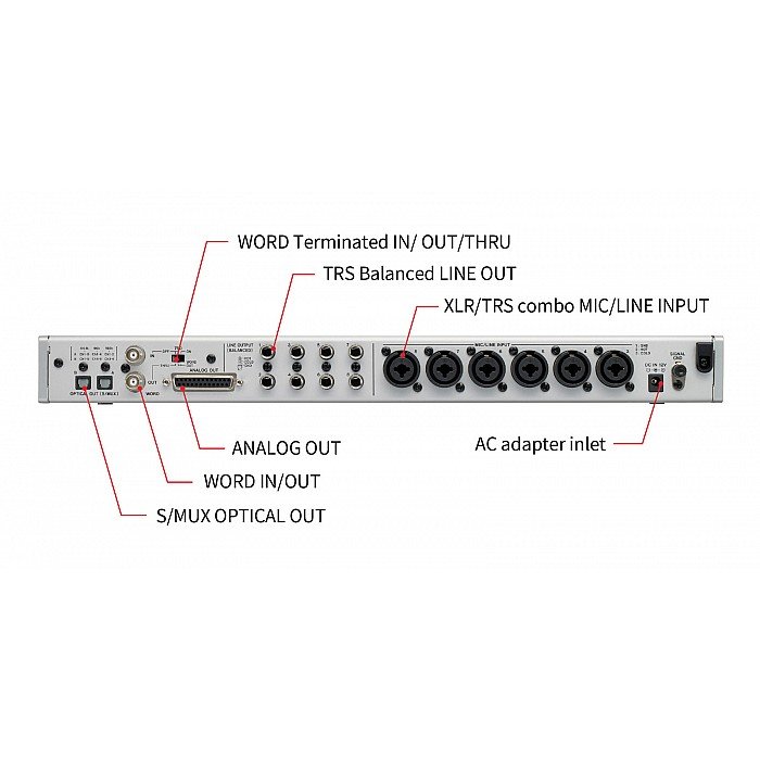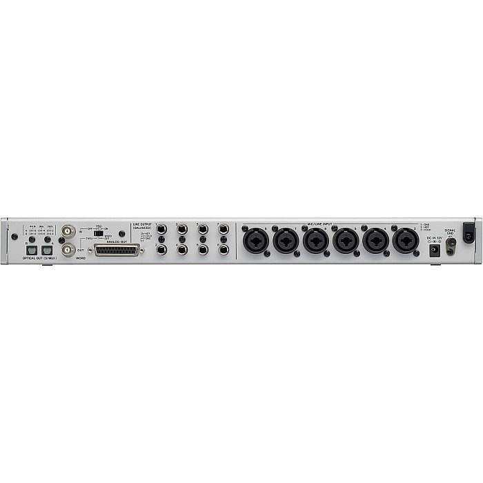 On the front of the unit, you'll find two combination XLR-1/4" input jacks for mic, line, or instrument usage. The rear provides six more XLR-1/4" combination jacks for line or microphone inputs. You'll also find eight 1/4" line outputs and a DB25 connector for all eight analog outputs. BNC wordclock I/O and optical ports are found on the rear as well.