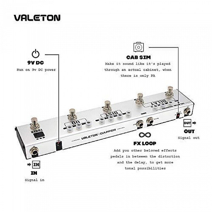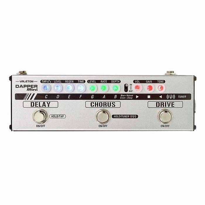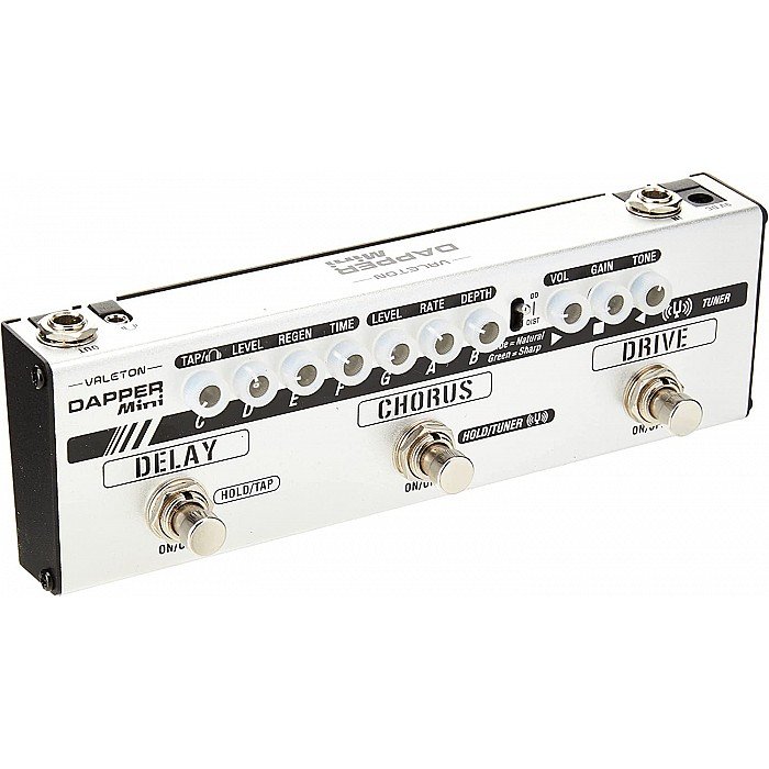 A mighty Mini - packs a punch. Most excellent brand new offering from Valeton. The new Dapper Mini is not a lame digital effects box crammed full of subpar offerings, but rather a grouping of quality analog effects all housed in a small strip configuration. Will fit on any pedal board or great as a carry along for any tonal situation. On board tuner, Delay with built-in Tap, Chorus and Drive section with OD or Distortion toggle switch. Valeton- the ones to watch! Product Description: Dapper Mini is a seriously potent effects strip with all the essentials for guitar.