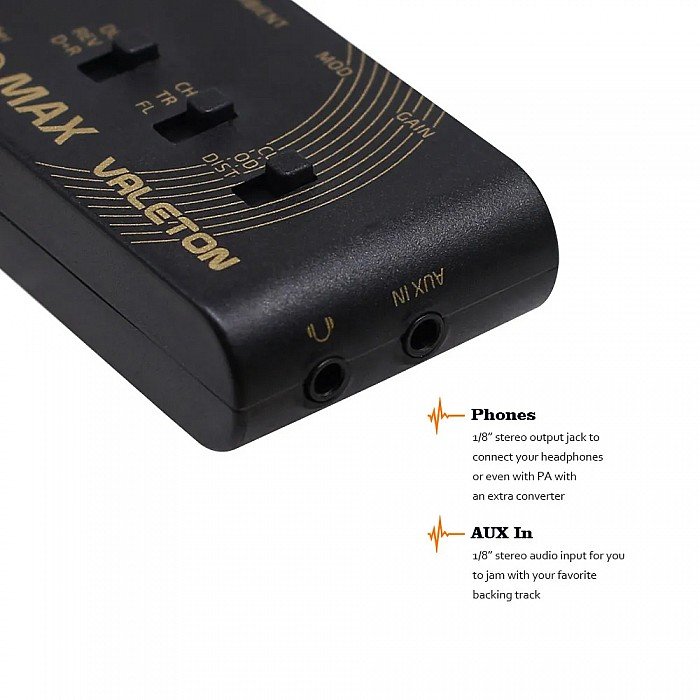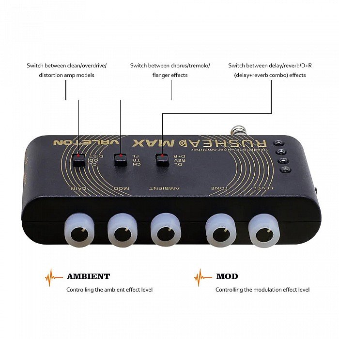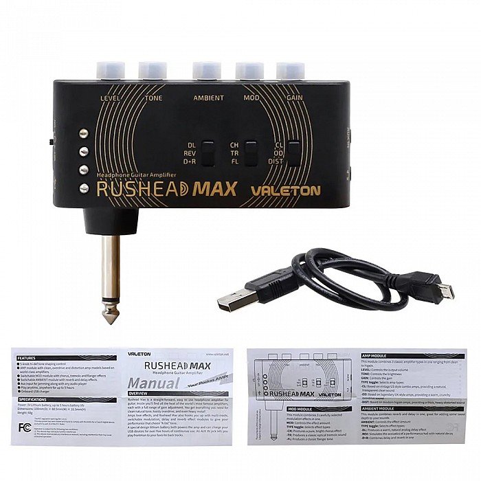 Rushead MAX is a straight-forward, easy to use headphone amplifier for guitar. Inside you’ll find all the heat of the world’s most famous amplifiers, each with a full range of gain adjustment. You get everything you need for clean natural tone, toasty overdrive, and even heavy metal! Amps love effects, and Rushead Max also hooks you up with multi-mode, switchablemodulation, delay and reverb effect modules to give your performance that choice “A-list” tone. With a special design lithium battery both powers the amp and can charge your USB devices for over five hours of continuous use. An AUX IN jack lets you play frontman to your favorite back tracks.