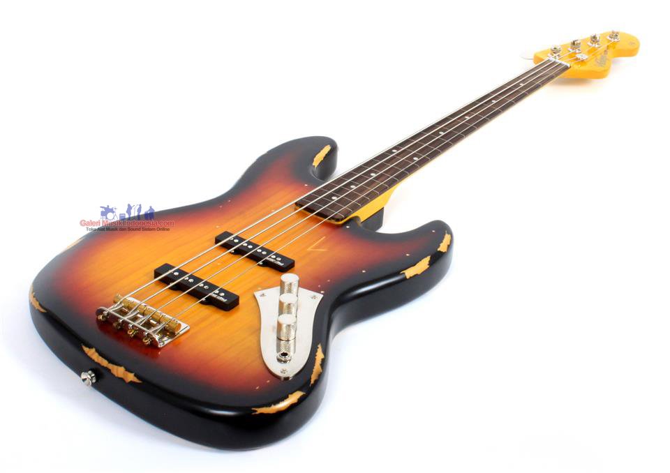 The Vintage V74MRJP Icon Series Bass Has an Eastern Poplar Body, Hard Maple Neck, Rosewood Fingerboard, Distressed Sunburst Finish, Bolt-On Construction, 34" Scale Length, Fretless, White Dot Inlays, Wilkinson PB WJB800 Pickups, 1 x Volume, Tone Controls, Chrome Hardware.