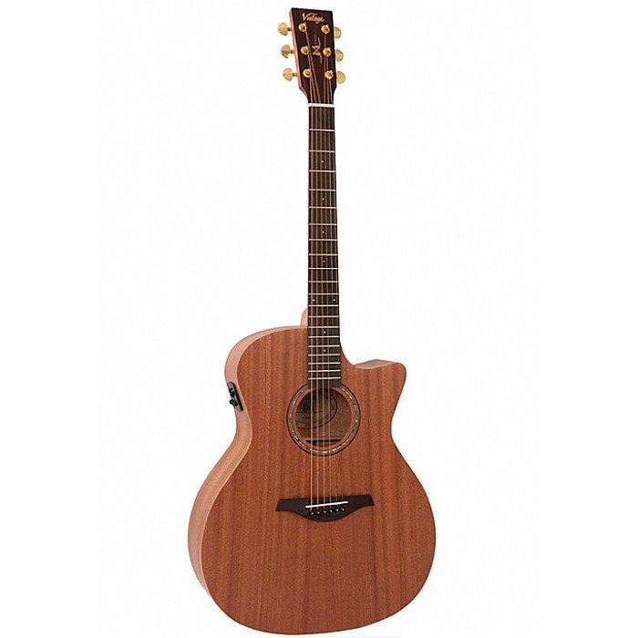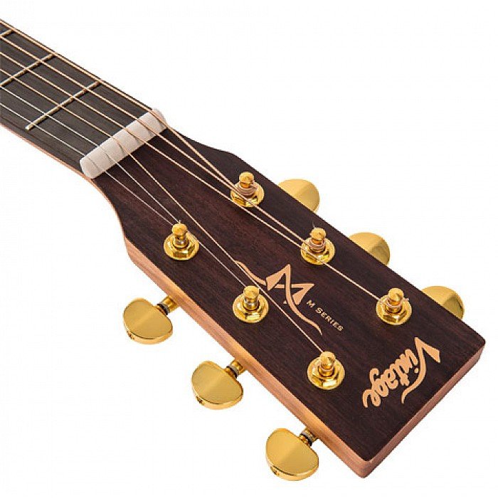 Joining the body at the 14fret, the ‘C’ profile mahogany neck, and the wonderful fingerboard offer superb playability, whilst smooth-geared die-cast gold plated machine heads in classic 3-aside format on the square tapered headstock with gold Vintage and M Series logos, ensure stable tuning. Played acoustically, this beautiful guitar has all the sonic merits that add up to outstanding electro-acoustic guitars, including touch-sensitive harmonics and dynamics.