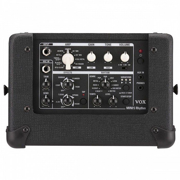 Ultra-compact modelling guitar combo amplifier from Mini series that delivers sound of 11 realistic amp models inherited from the popular Valvetronix series that ranges from intense high-gain type to pristine clean sounds. It also offers 8 effects: 4 standard effects – chorus, compressor, flanger and tremolo, and 4 types of delay/reverb, and proprietary VOX “Bassilator” circuitry that delivers a heavy sound with ultra-low frequency and creates a rich low-end rhythm response. Amplifier also provides a variety of rhythm patterns organized into 10 genres plus metronome patterns, altogether offering up to 99 choices, with tempo range of 40-240 bpm. It is equipped with 6.5” speaker, separate controls for amp, rhythm and effects set-up, high-performance built-in E-string tuner (tuning range E1, 41.2 Hz – E6 1318,5 Hz), Power Select switch that allows adjusting the volume without impairing tonal characteristics, an independent microphone input jack that can be used with a delay/reverb effect, aux input for connection of MP3 player, or headphone/line output with a cabinet simulator that can reproduce the resonances of a speaker cabinet. Amplifier features classic VOX design with rugged metal grill and carrying strap for convenient transportation. It can be powered by six AA batteries or an AC adapter (included). Dimensions: 269 x 179 x 267 mm. Weight: 3.5 kg. Classic Design colour combination.