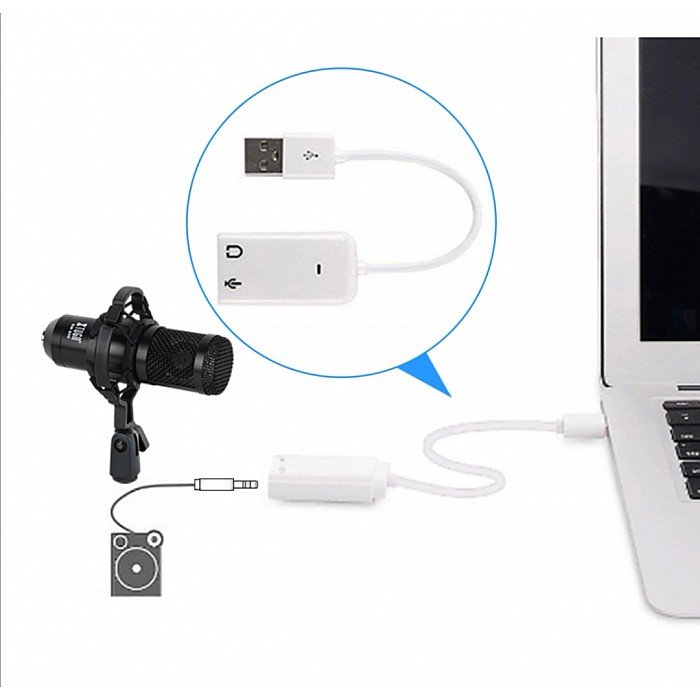 This is a condenser microphone only work with the device that could provide enough power for it. When connected with desktop computer, the condenser microphone could be used alone. When connected with laptop computer, please connect the laptop to electrical outlet, or use a 48V phantom power to get enough power if the sound is not clear and high enough. If your device could not provide enough power(When used with Amplifier or Mixer,etc.), the sound volume recorded might be low, and please use a extra 48V phantom power adapter to connect it.(phantom power adapter is not included).