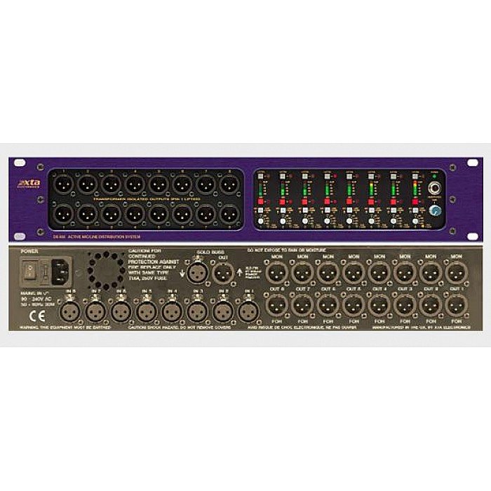 With exceptional dynamic range as standard, each input is split into 2 transformer-isolated outputs (-10dB level) and 2 actively balanced outputs. The unit can be internally reconfigured to give more than the standard 4 outputs from each input, up to a total number of 32 outputs. Each input features remote activated pad, adjuustable gain, mic/line switch, 48V phantom power, 5 segment LED metering, and "listen" facility.