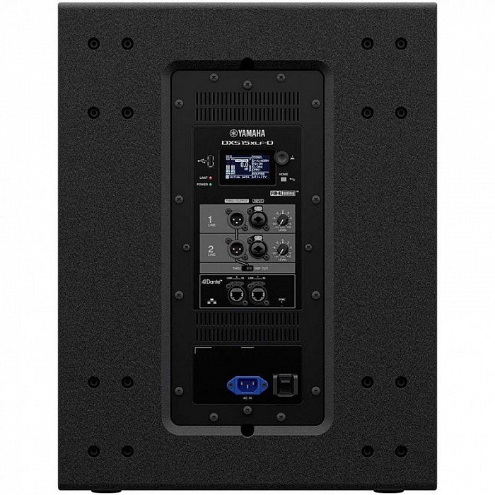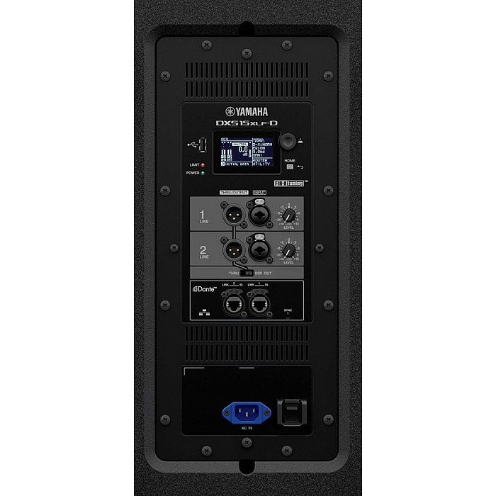 The rear panel offers two combo XLR-1/4" inputs with XLR thru/outputs and dedicated level controls. A USB port allows for system upgrades and preset configuration and backups. The DXS15XLF-D is equipped with an additional panel with two etherCON connectors (2-in/2-out) for interfacing with other Dante-compatible equipment such as other speakers and Yamaha's CL/QL/TF digital mixing consoles. The Yamaha DXS15XLF-D ships with a standard IEC power cord.