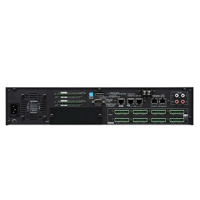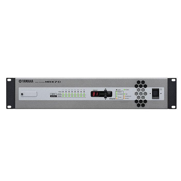 The MRX7-D from Yamaha is a Dante-enabled signal processor that delivers control and flexibility to a wide range of applications, including corporate conference rooms, educational facilities, shopping malls, and more. Its configurable architecture makes it easy to create customized solutions for professional audio setups while optimizing digital signal processing (DSP), making the MRX7-D a great choice for networking devices over a long distance—no matter whether your setup is small or large, simple or complex, or anywhere in-between. Dual Dante ports make the MRX7-D effortlessly compatible with any Dante-enabled products, such as microphones, digital mixers or amplifiers, and other signal processors. The MRX7-D’s wide range of interconnectivity options includes Yamaha’s selection of Digital Mixers and XMV-D amplifiers.