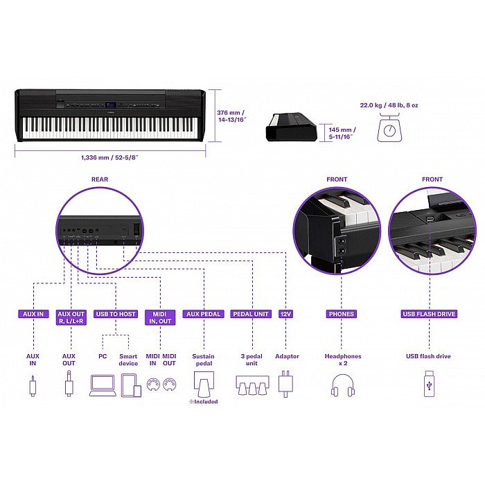 The P-525 is the premium model of Yamaha's world-renowned P Series compact digital pianos, offering authentic feel, beautiful sound, and enhanced Voices for key instruments. Piano Voices are derived from two world-class concert grand pianos: the Yamaha CFX and the Bösendorfer Imperial. With speaker output, as well as the variety and quality of Voices, including organ and electric piano, are significantly improved over its predecessor, the P-515.