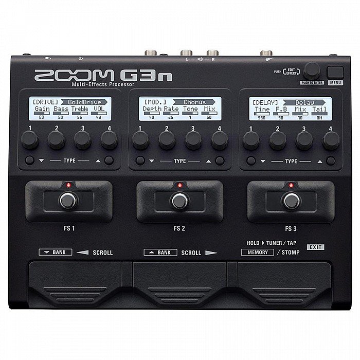 With the power of an advanced multi-effects unit combined with the convenience of a pedalboard, the Zoom G3n guitar effects and amp simulator pedal is your go-to all-purpose guitar tone tool. Three large LCD displays and footswitches give you a genuine stompbox experience, and individual controls for effects and amp modeling make the G3n an invaluable live tool. Other features, such as an onboard tuner, looper, and rhythm patterns are especially handy for private practice. Dual outputs allow you to send stereo effects to your recording device or PA system directly from the Zoom G3n.