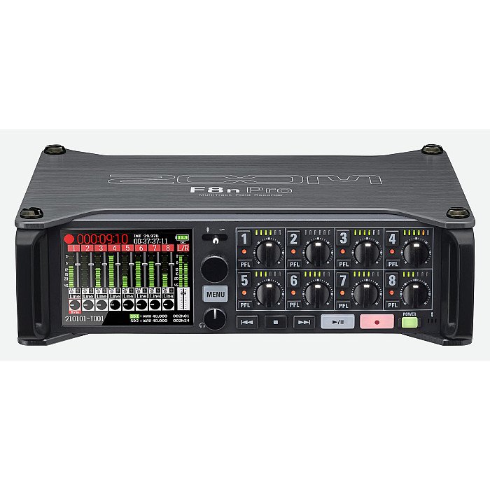 Capture any location footage quickly and cleanly with the Zoom F8n Pro, a pocket-friendly multitrack field recorder with 32-bit float technology for incredible dynamic range that frees you from clipping and manual gain adjustments. Offering 8-input / 10-track recording, separate converters for soft and loud sounds, and a high-grade preamp with mic/line input switching, the F8n Pro packs quantity and quality into a sturdy frame that's more than ready for filmmaking, production/mixing location sound, sound effects recording, and electronic news gathering. From the large, informative color display and easy-to-use controls to the flexible powering methods, remote control options, and precise timecode functionality, the F8n Pro is well equipped to please beginners and demanding veterans alike. Whether you need long-form stereo recording for interviews, redundant multi-microphone setup capture for video recording, or Ambisonics sound files for virtual reality and 360 audio projects, the F8n Pro has the modes, resolution, and media support to handle your critical audio tasks.